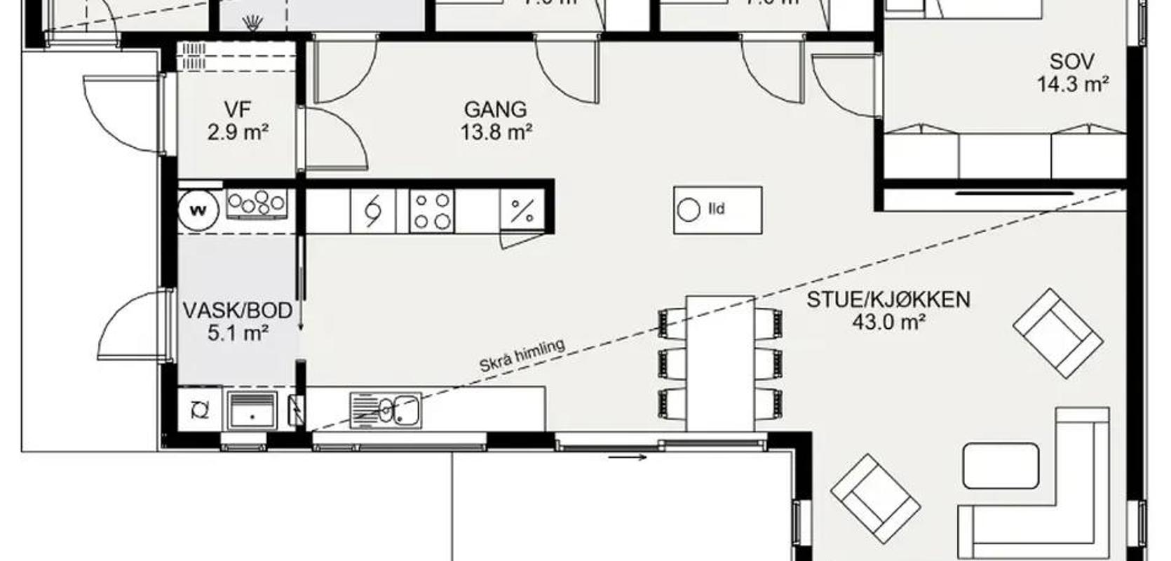 En annen fordel med Lindås er pulttaket som gir ekstra takhøyde i stuen og oppholdsrommet. Dette skaper en luftig og romslig atmosfære, samtidig som det slipper inn rikelig med naturlig lys gjennom de mange vindusflatene. Den åpne planløsningen mot kjøkkenet gir en følelse av sammenheng, samtidig som kjøkkenet er delvis avskjermet. Fra kjøkkenet har du også tilgang til vaskerommet.
