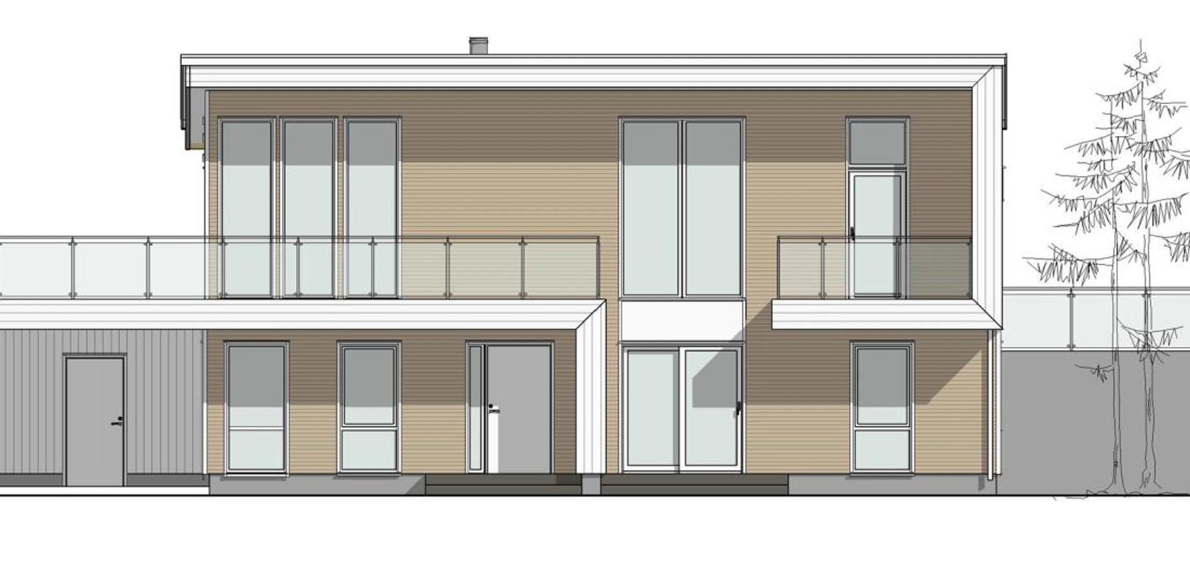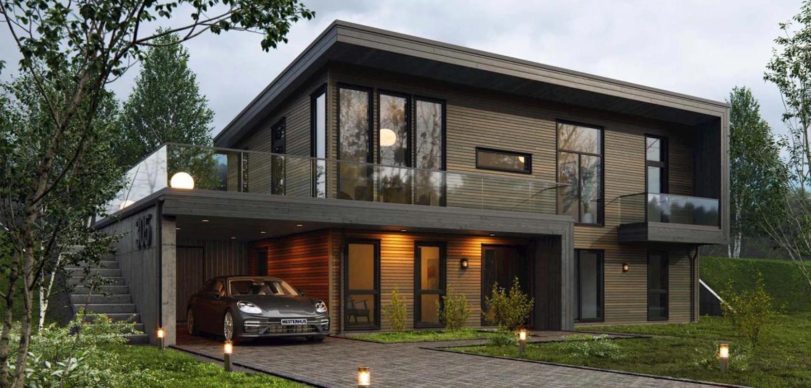 Opplev det moderne designet til denne store eneboligen med en spennende og stram fasade, preget av rene linjer og store vindusflater. To balkonger og terrassen er omgitt av glassrekkverk, som skaper en spennende kontrast til den liggende kledningen i tre.